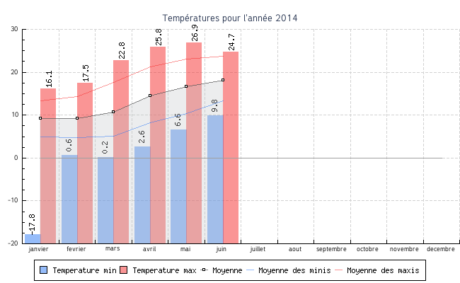 | juin | 9.8 °C | 13.4 °C | 24.7 °C | 23.7 °C | 18.2 °C | 3.5 km/h | 29.0 km/h | OSO |