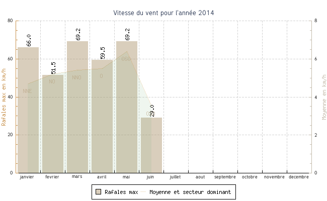 | avril | 2.6 °C | 8.3 °C | 25.8 °C | 21.3 °C | 14.5 °C | 5.5 km/h | 59.5 km/h | O |